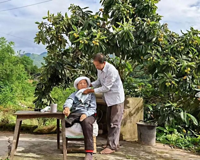 图为谭家田为妻子黄能英洗漱。