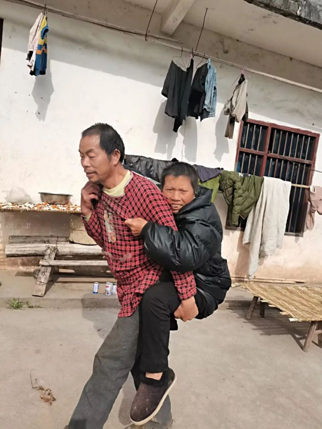 图为谭家田背着妻子黄能英。