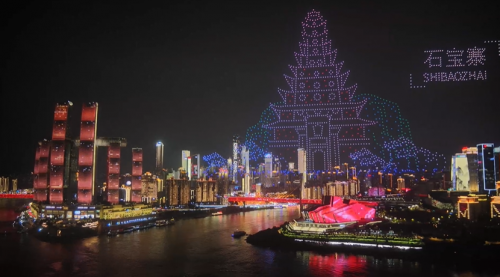 石宝寨无人机图案惊艳亮相重庆夜空!忠县文旅名片闪耀山城